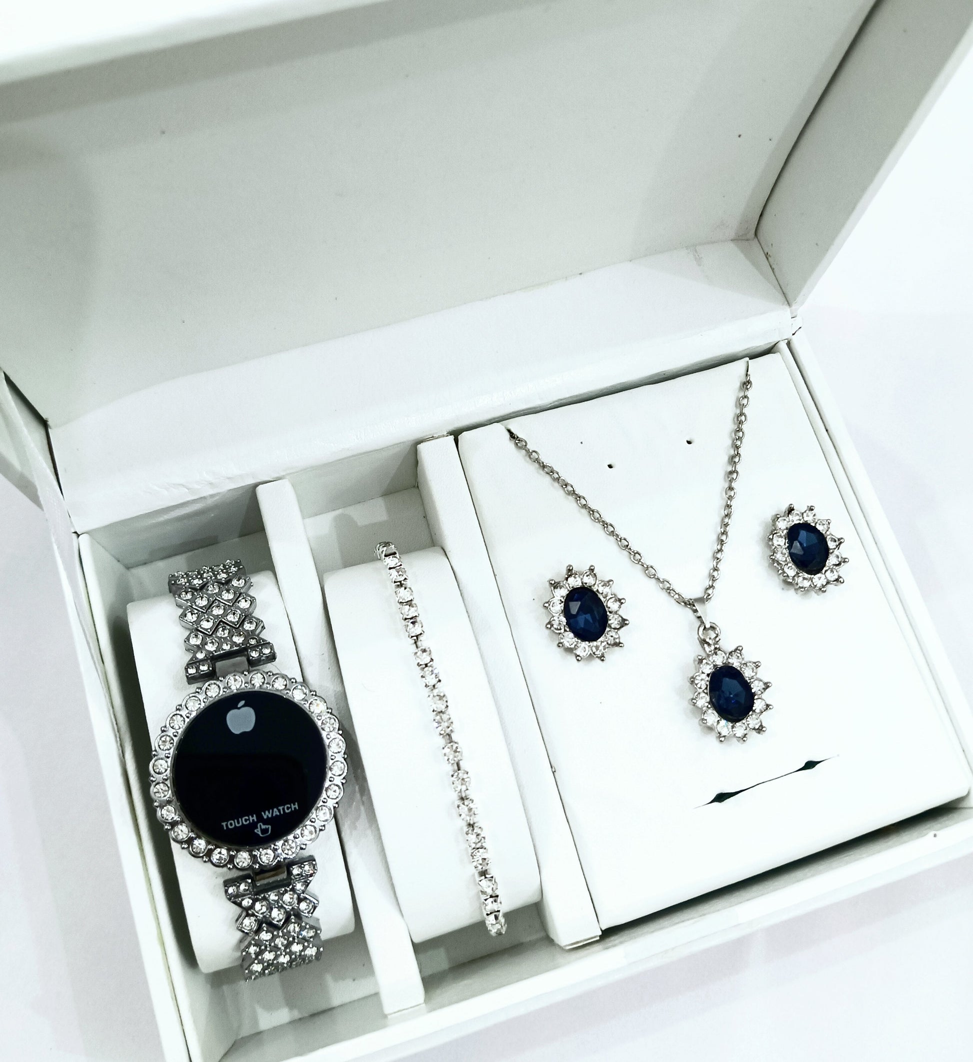 Round Touch Silver watch with Crystal Jewelry Set